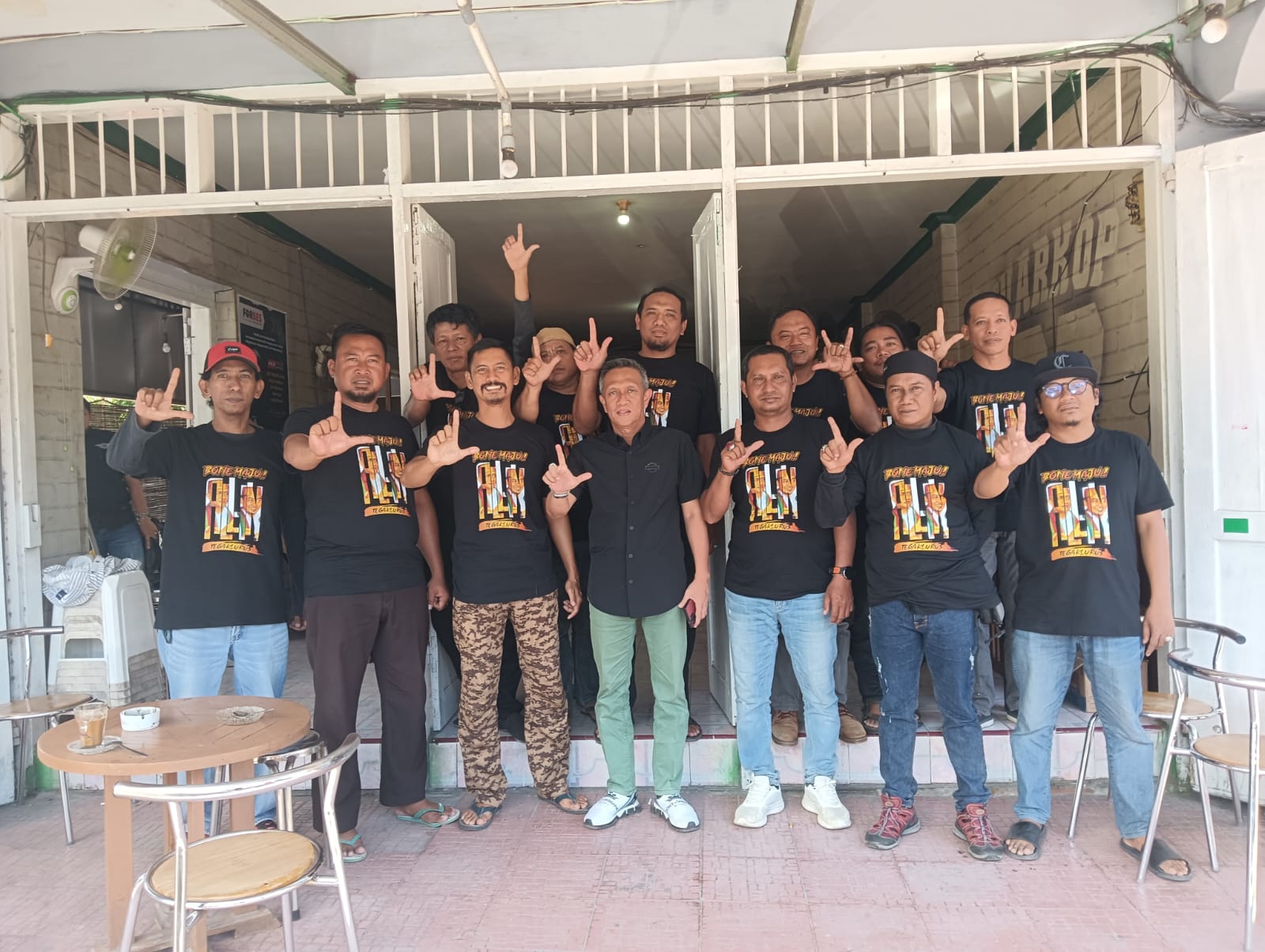 Andi Islamuddin dengan Taqline Tegak Lurus “JADI ALL- IN” sambil tersenyum mengajak para pemuda meneguk kopi manis yang disuguhkan warkop 23.